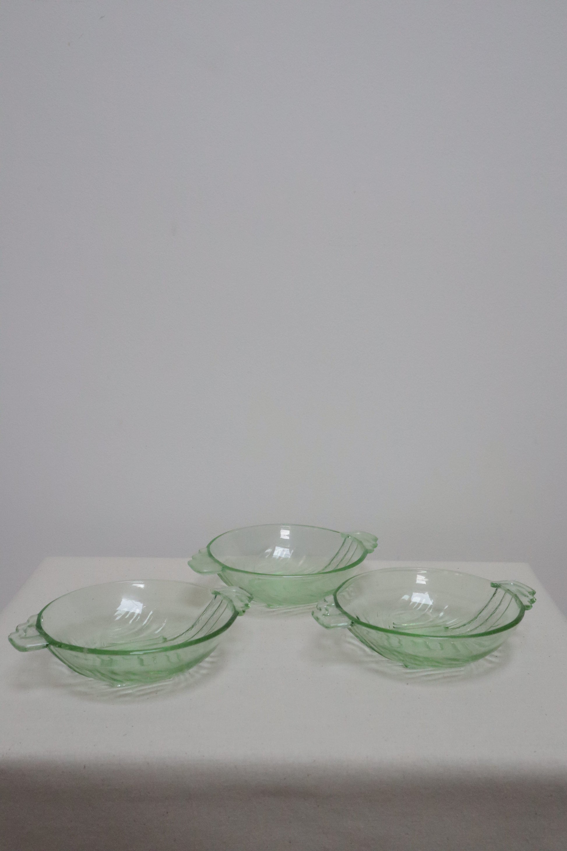A set of green glass bowls with Art Deco styling. The fascinating modernist design really make these bowls stand out and are practical and pleasing. As this is a vintage piece there is age related wear.