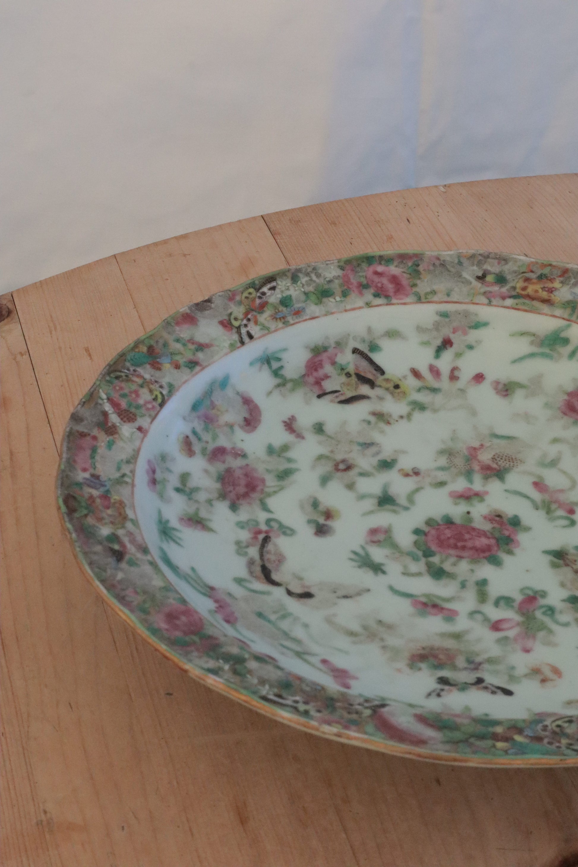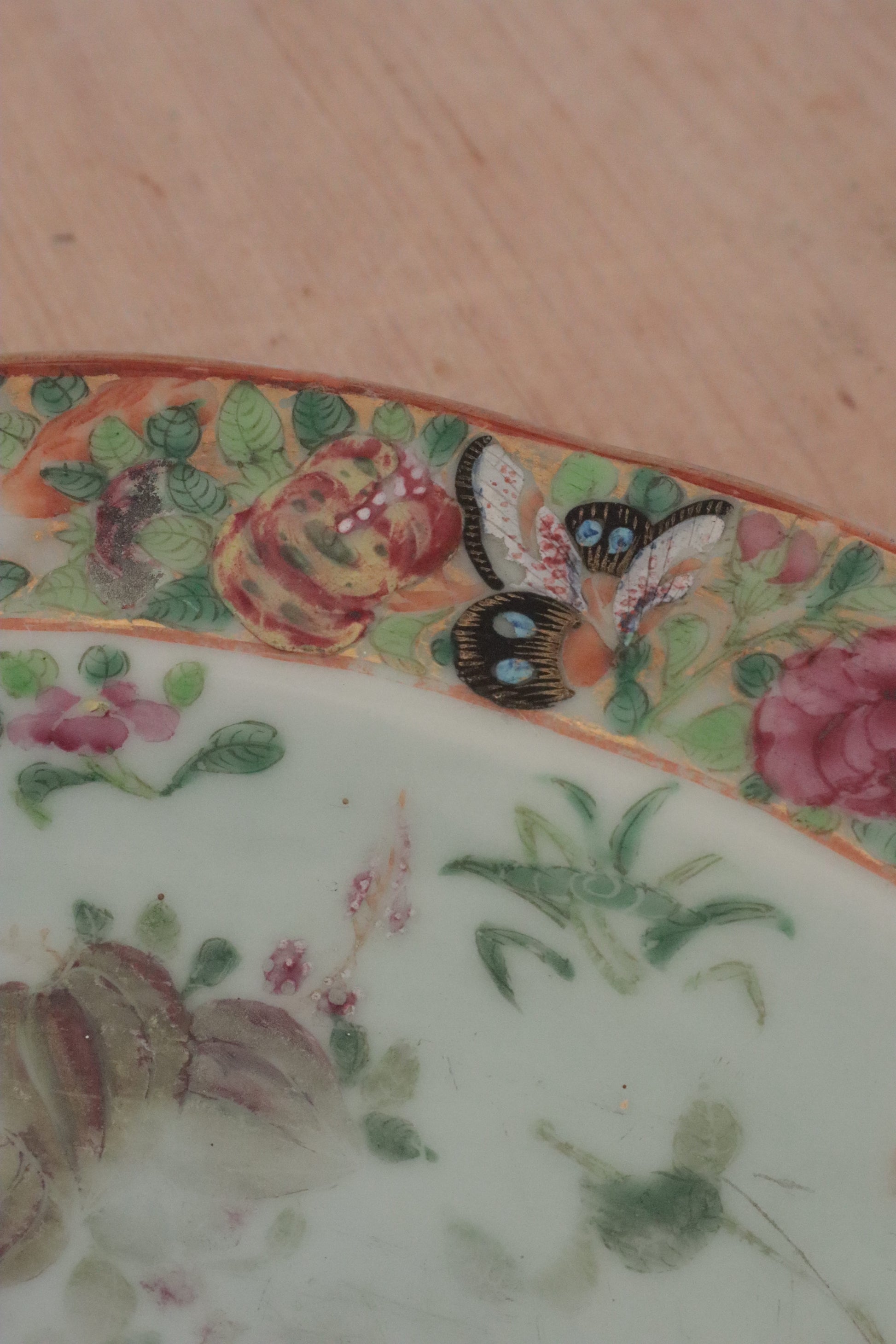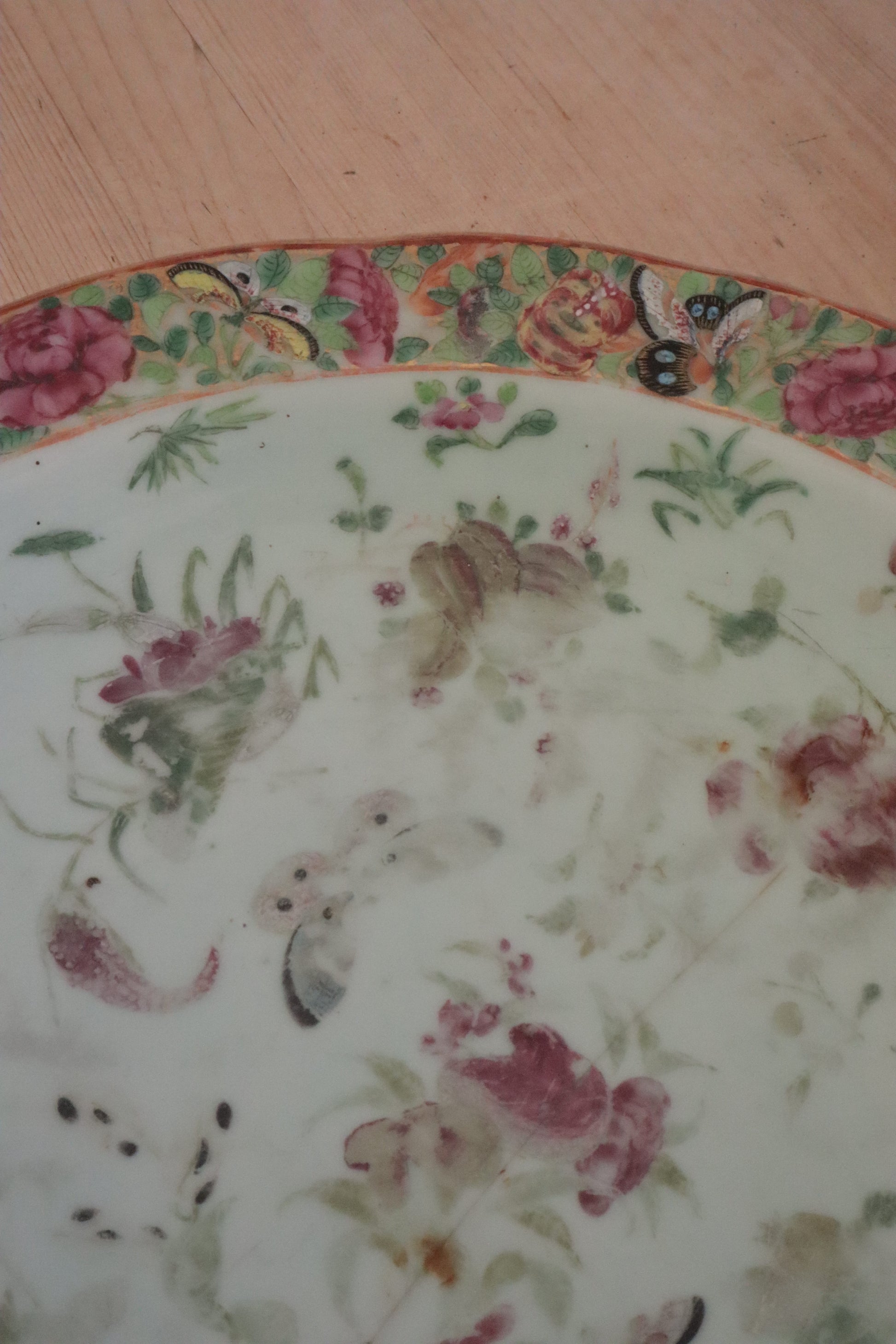 A large and magnificent Chinese porcelain large dish or charger. The shallow, shaped dish of foliate form and decorated with shades of green, blue, yellow and red against a white porcelain. Featuring various blossoming trees and flowers, possibly , some with butterflies flitting about. With gilt highlights throughout. With an unidentified mark in underglaze blue within a double square, surrounded by a double circle. As can be seen in the photographs, there is historical damage to these.