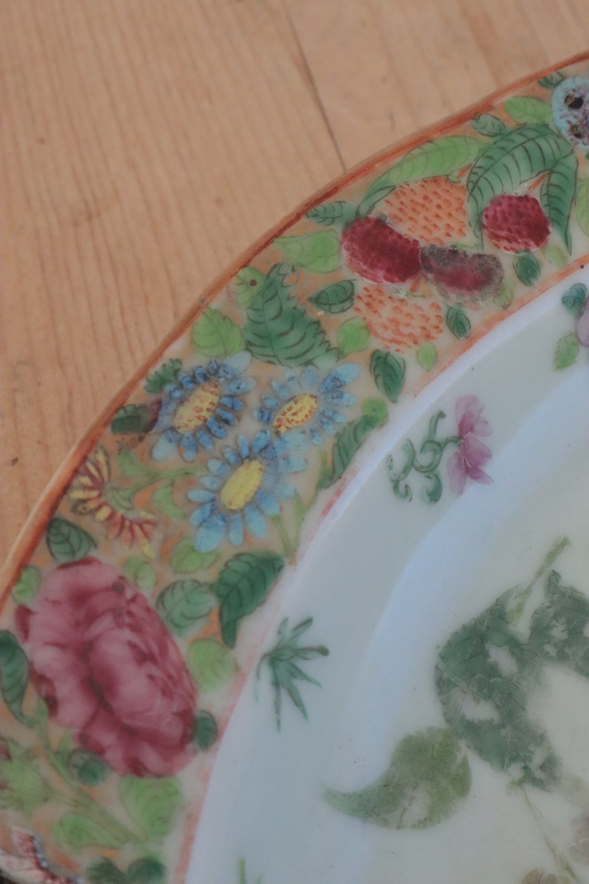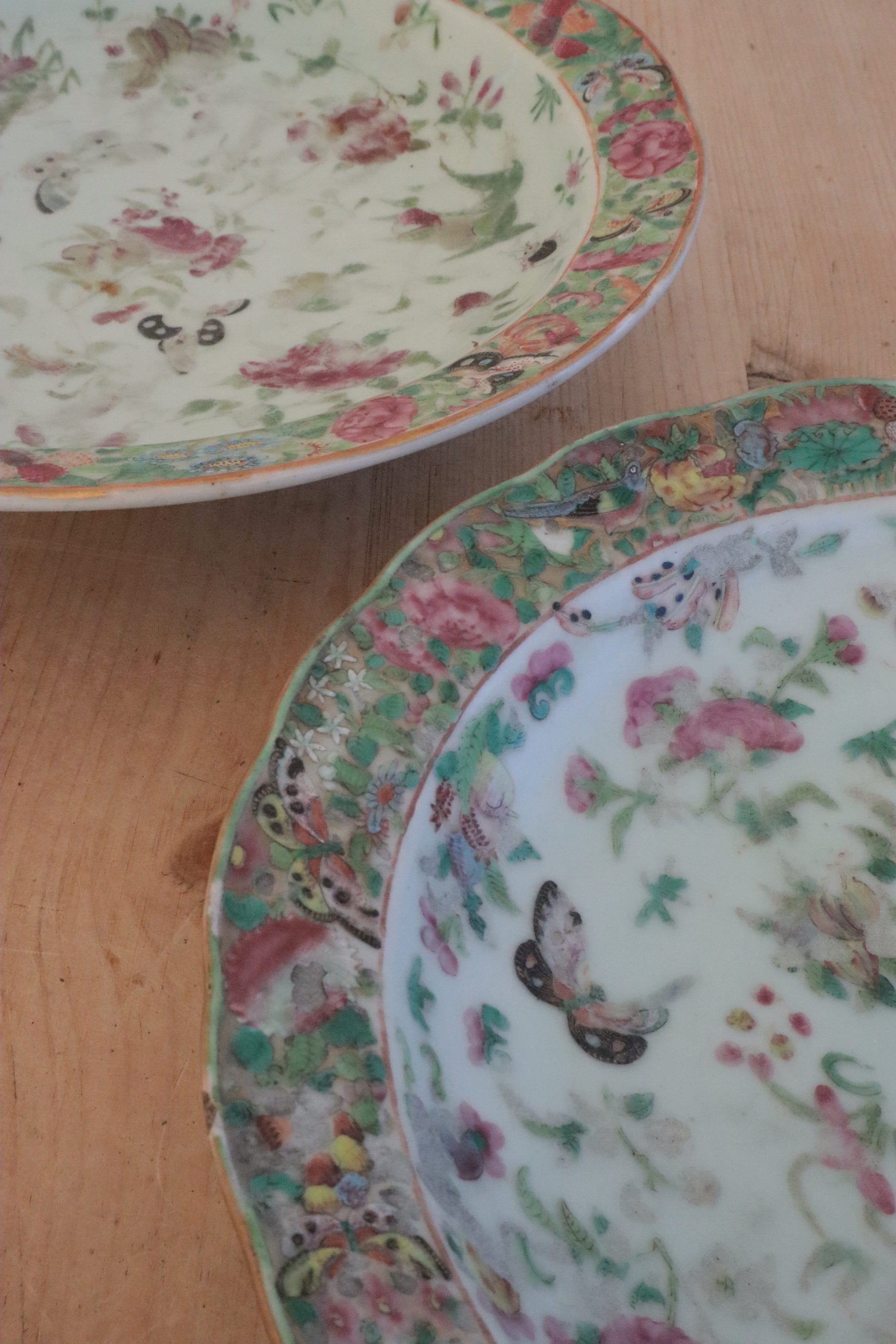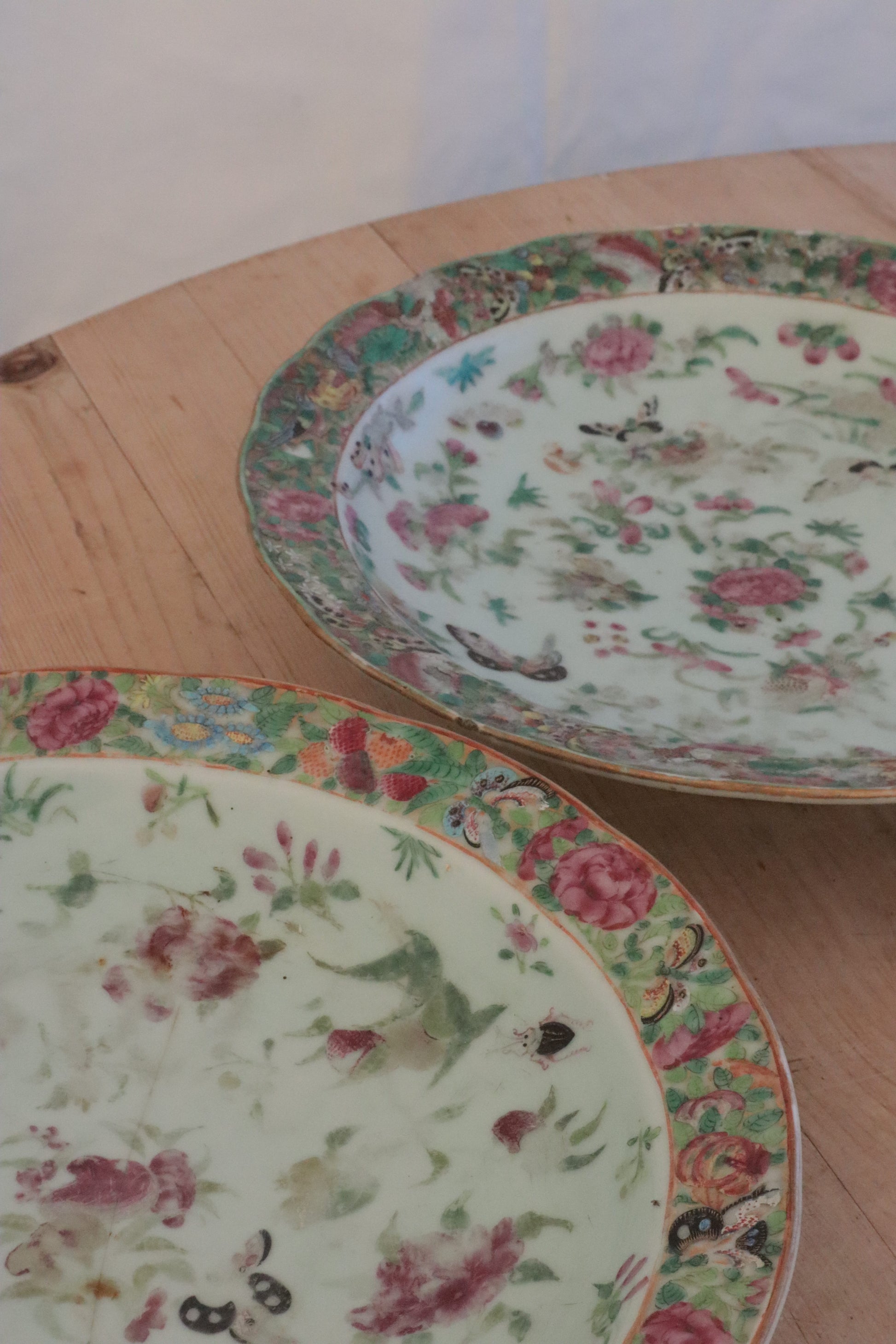 A large and magnificent Chinese porcelain large dish or charger. The shallow, shaped dish of foliate form and decorated with shades of green, blue, yellow and red against a white porcelain. Featuring various blossoming trees and flowers, possibly , some with butterflies flitting about. With gilt highlights throughout. With an unidentified mark in underglaze blue within a double square, surrounded by a double circle. As can be seen in the photographs, there is historical damage to these.