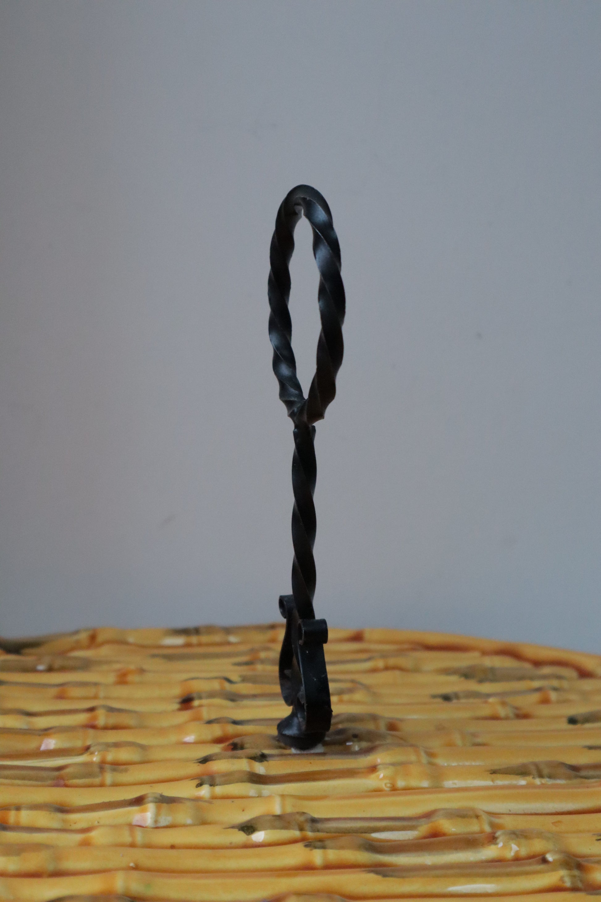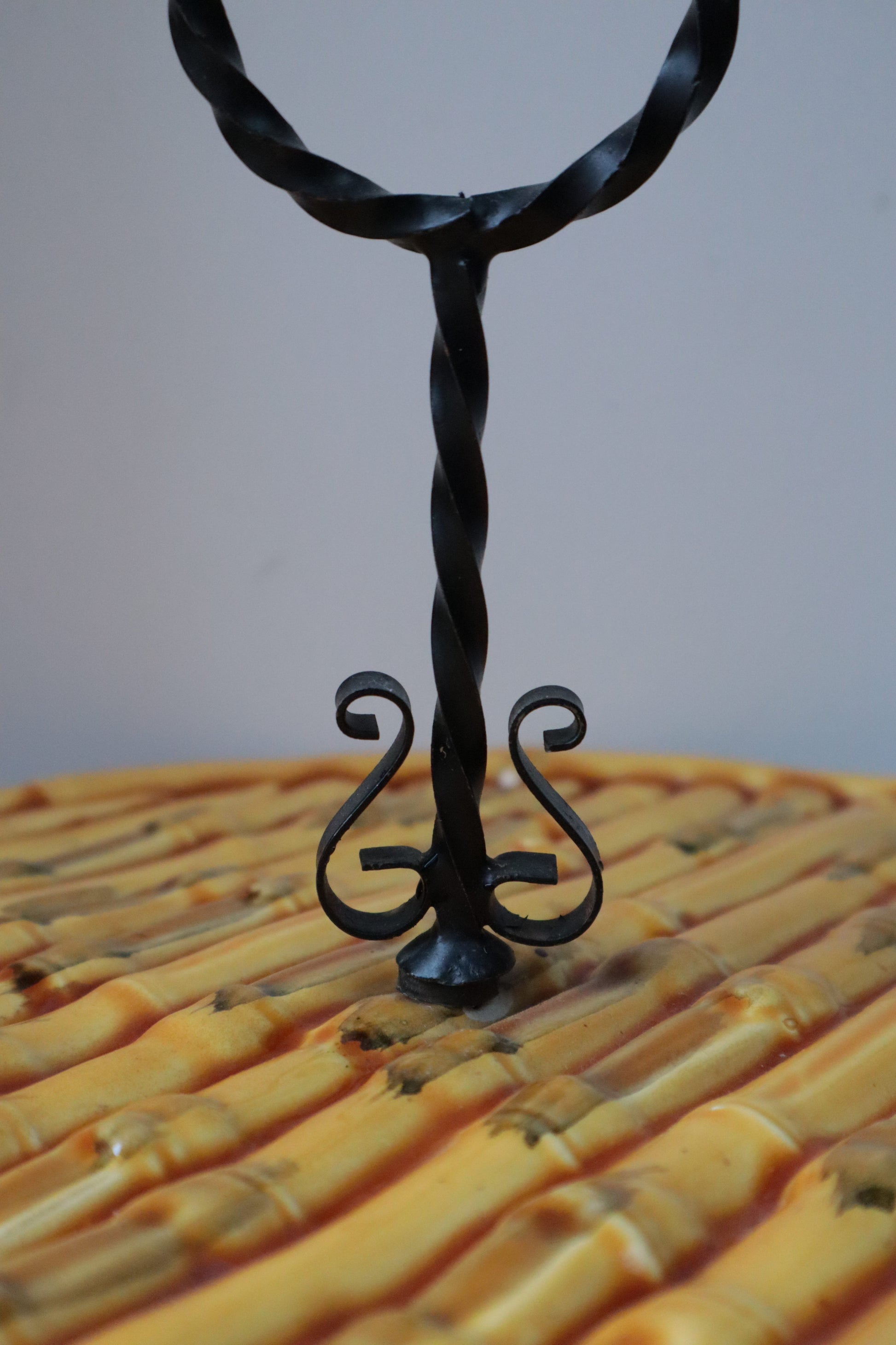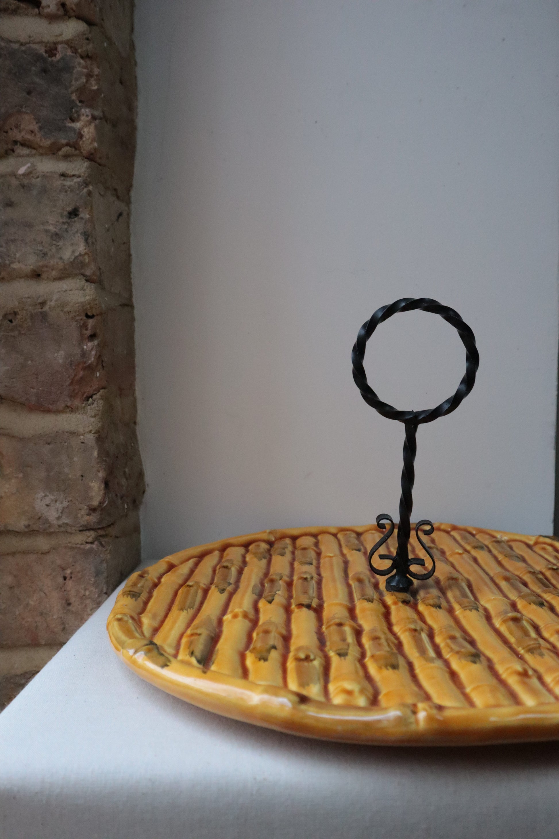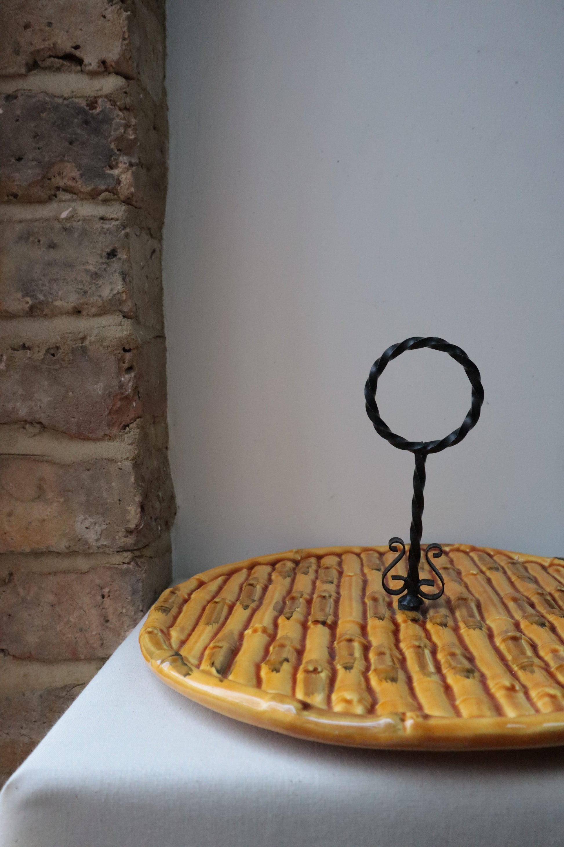 A charming, glazed yellow cake stand with faux bamboo decoration and a twisted metal handle. As this is a vintage piece there is age related wear.