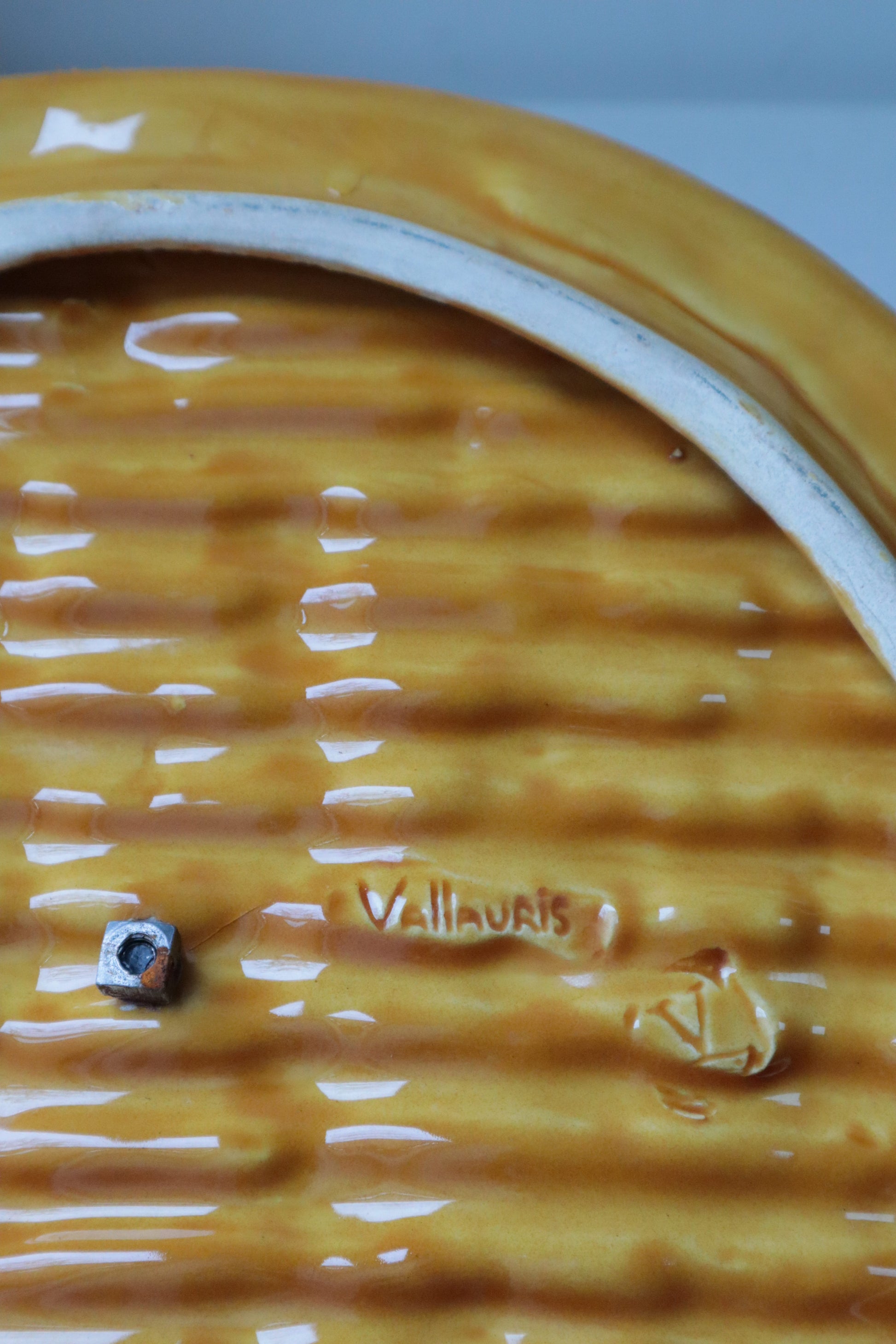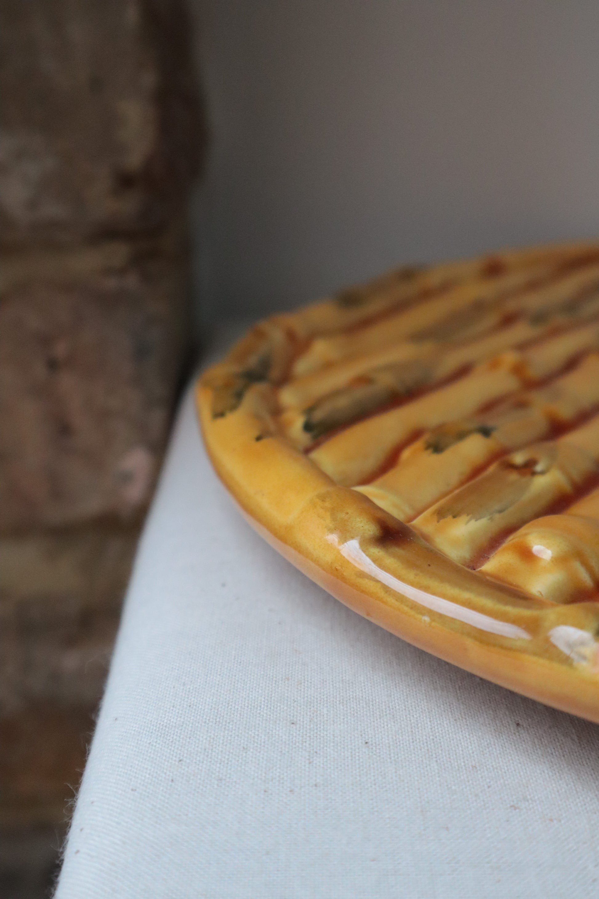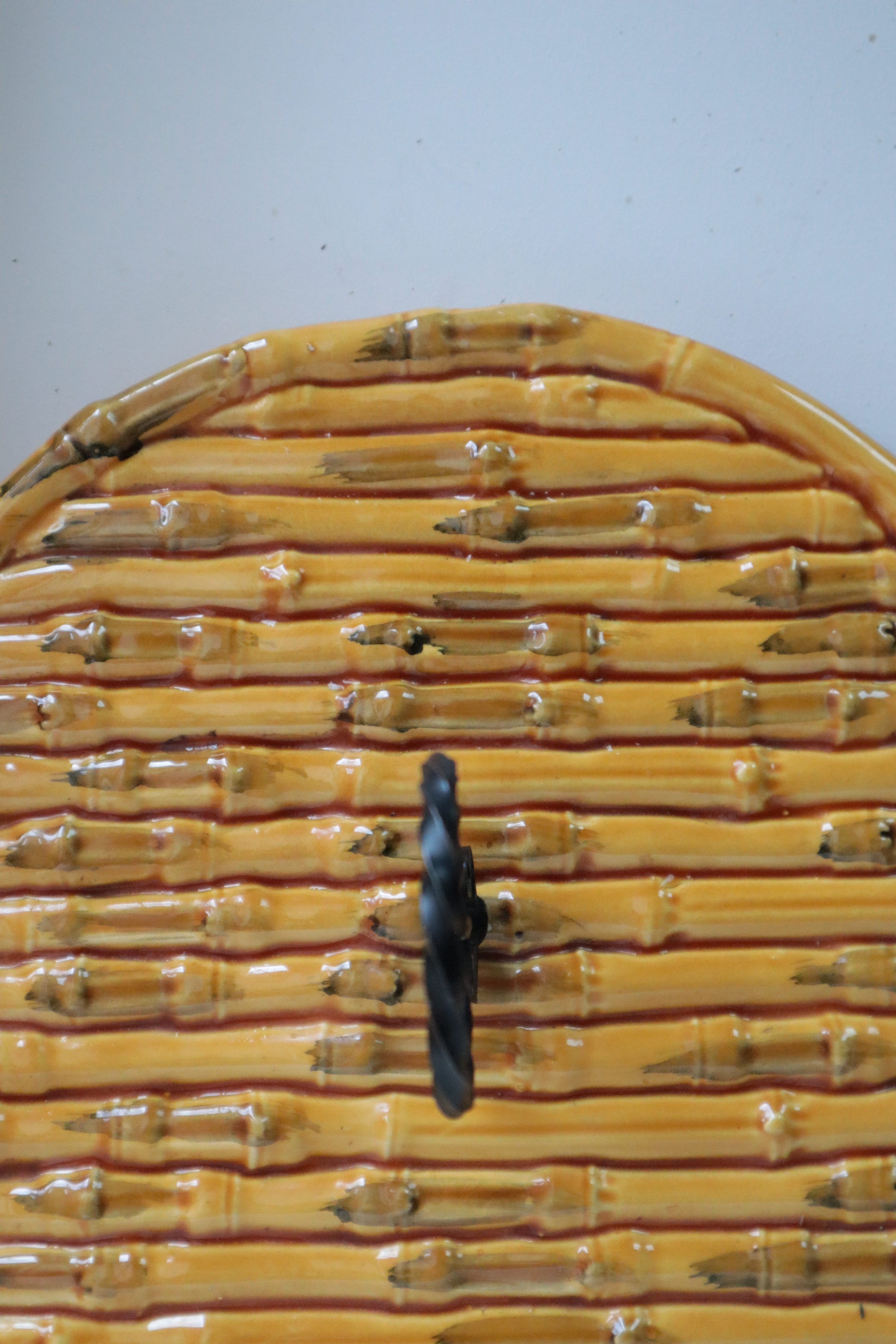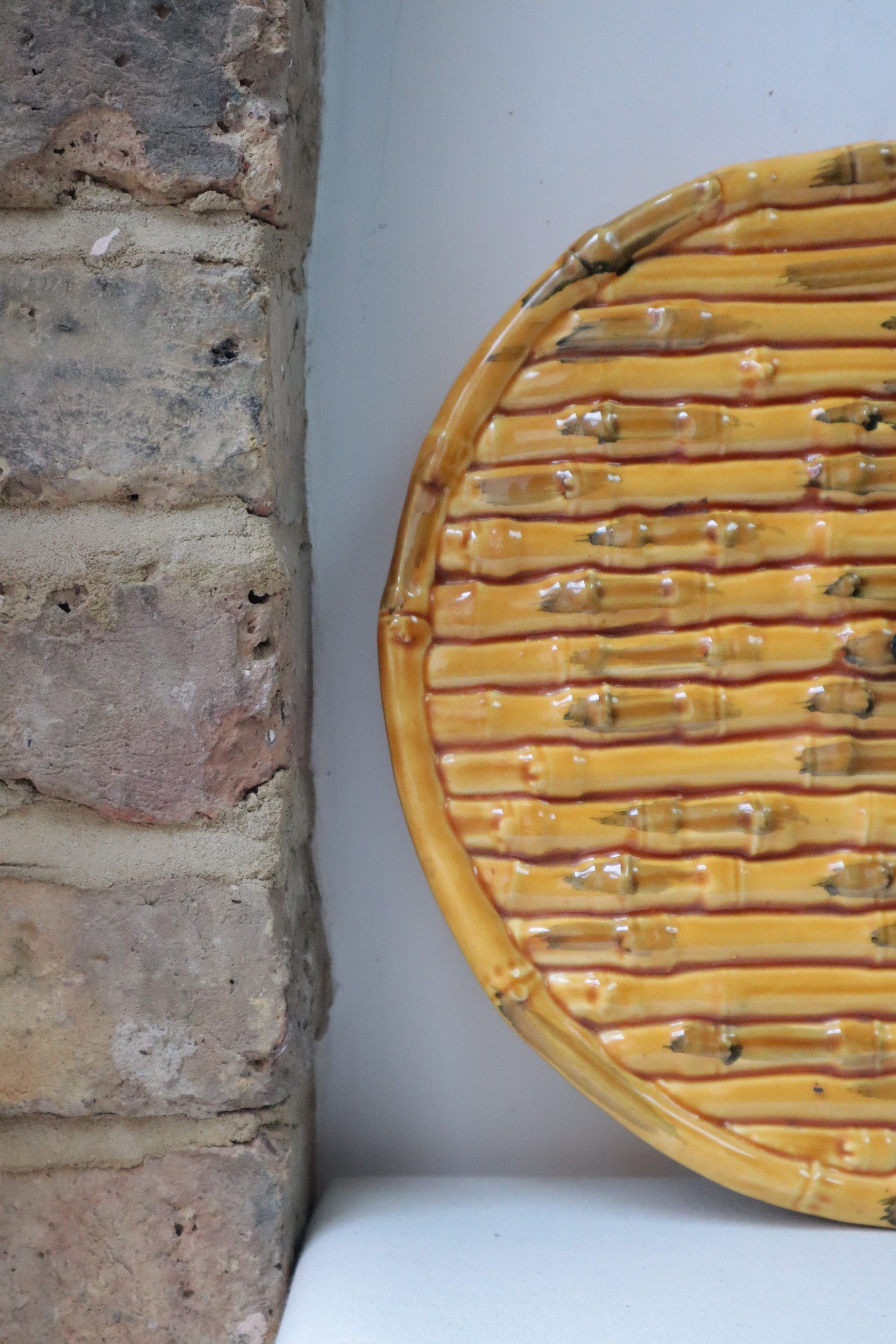 A charming, glazed yellow cake stand with faux bamboo decoration and a twisted metal handle. As this is a vintage piece there is age related wear.